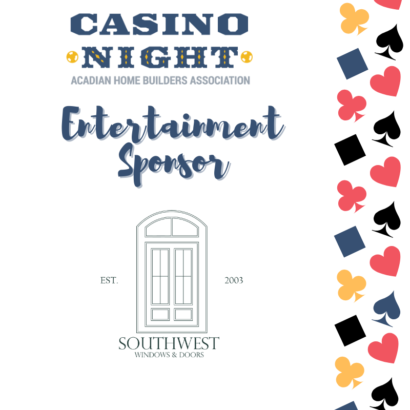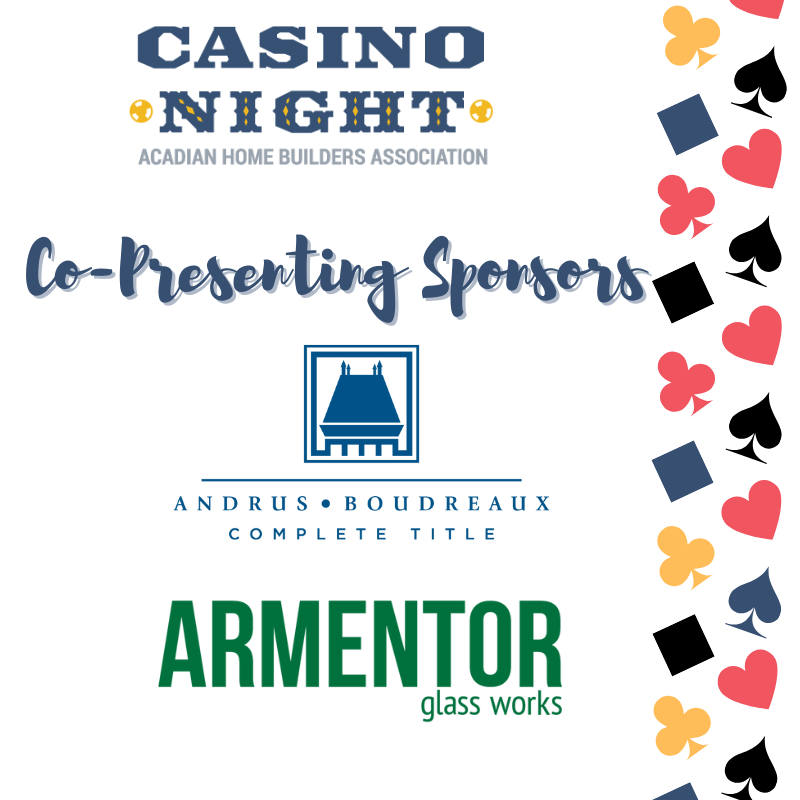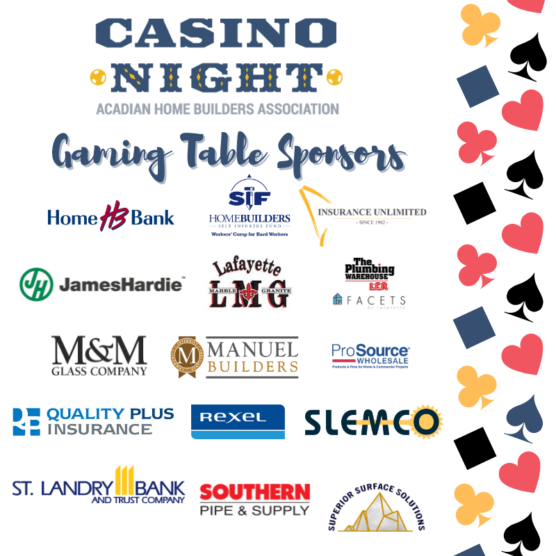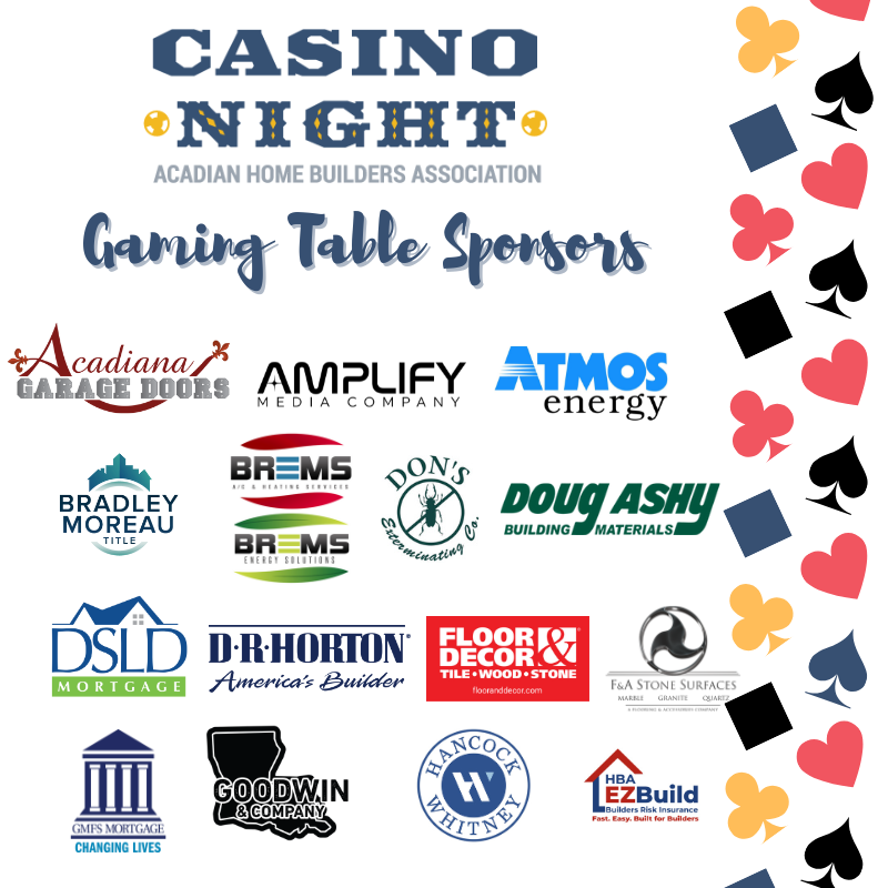 Join AHBA for a night of games, drinks, food, and fun! Casino Night annually attracts 300+ seeking a night filled with live music, food and adult beverages and a silent auction! Gaming tables include poker, blackjack, roulette and craps and your ticket affords you $2000 in PLAY MONEY! Proceeds from the evening’s silent auction help the organization continue its efforts to provide quality, affordable housing to the people of Acadiana.